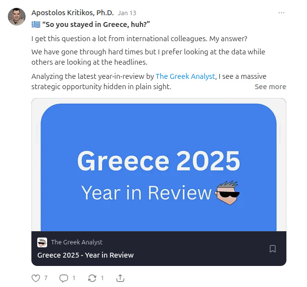 Πολλοί αναρωτιέστε γιατί υπάρχει άρθρο του Greek Analyst σε κάθε τεύχος. Όχι, δεν έχουμε κάποια οικονομική συμφωνία (οπότε πάει η ευκαιρία για φράγκα 😂). Εγώ ξεκίνησα να βάζω άρθρα του γιατί μου αρέσει να έχω μια ανάλυση σχετική με την Ελλάδα σε κάθε τεύχος και εκείνος ήταν αρκετά ευγενικός να προτείνει τα δικά μου substack στους αναγνώστες του (χωρίς να το ζητήσω). Κάπως έτσι δούλευε το Internet τα παλιά χρόνια. Με ενδιαφέρουσες online γνωριμίες, συστάσεις φίλων σε φίλους και αμοιβαίο σεβασμό!